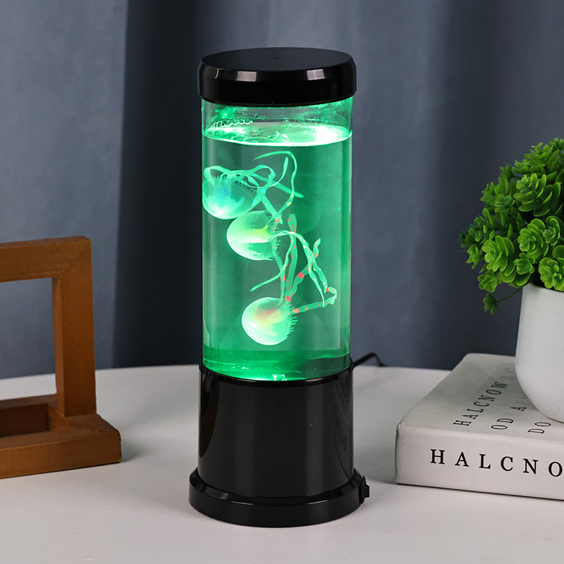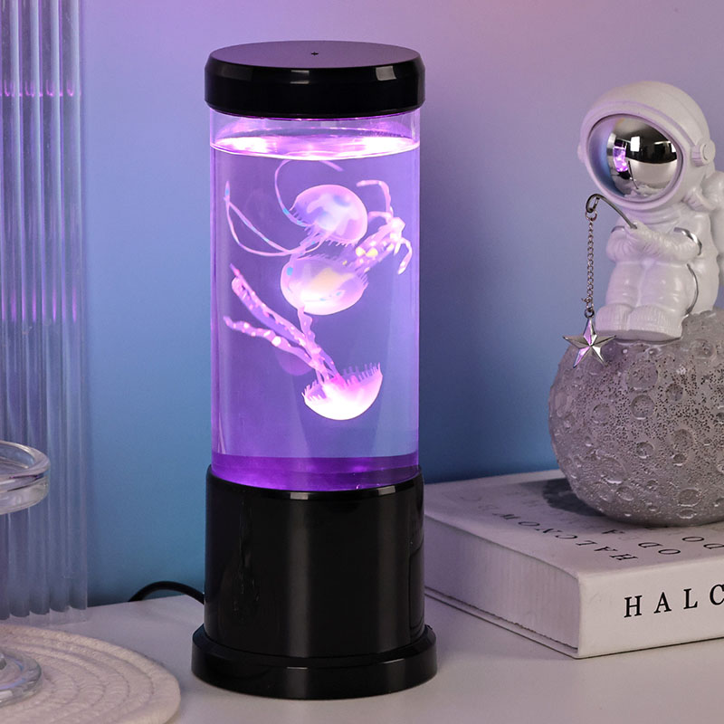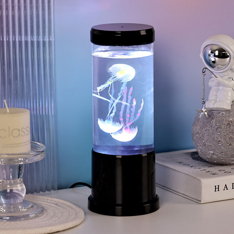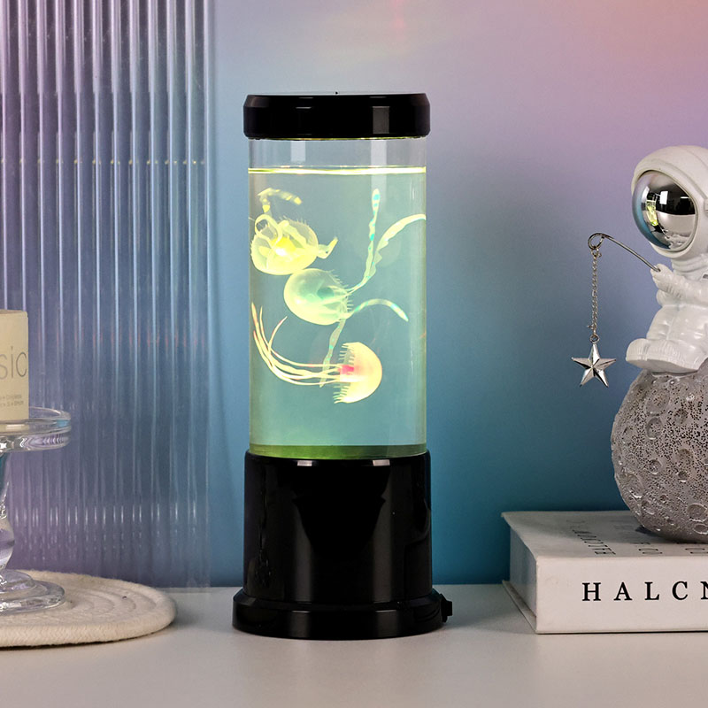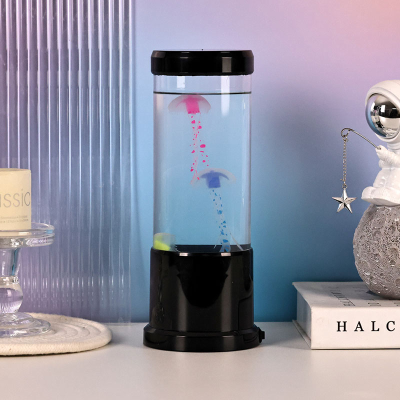 A lâmpada apresenta uma lâmpada de água-viva de sombra preta realista flutuando suavemente dentro de um tanque cilíndrico transparente, criando um ambiente subaquático relaxante que transforma qualquer ambiente em um retiro oceânico sereno.