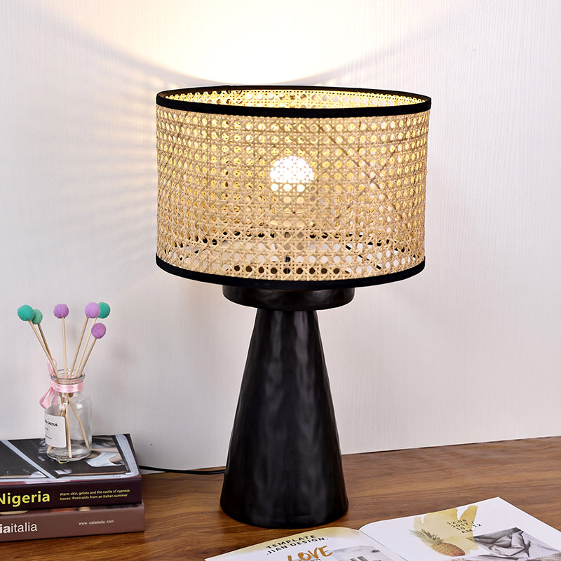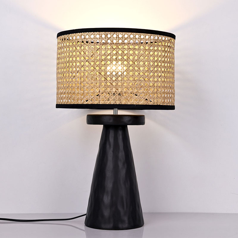 A seleção do material é engenhosa e a base é feita de material cerâmico, delicado, liso e com textura superior. Não é apenas resistente e durável, mas também adiciona elegância e estabilidade à luminária de mesa. O abajur é feito em tecelagem de bambu, o que confere ao abajur texturas únicas e beleza natural, fazendo com que a luz emitida pareça mais suave. Ao mesmo tempo, a respirabilidade do bambu também acrescenta um charme único ao efeito de iluminação. A combinação de cerâmica e tecelagem de bambu não só mostra o charme do artesanato tradicional, mas também reflete o uso inteligente de materiais naturais.