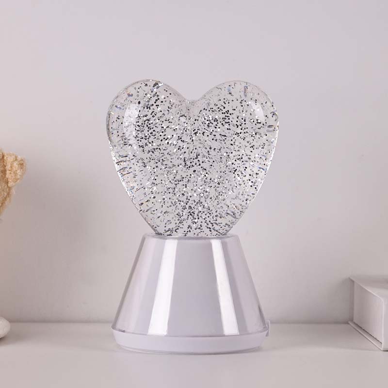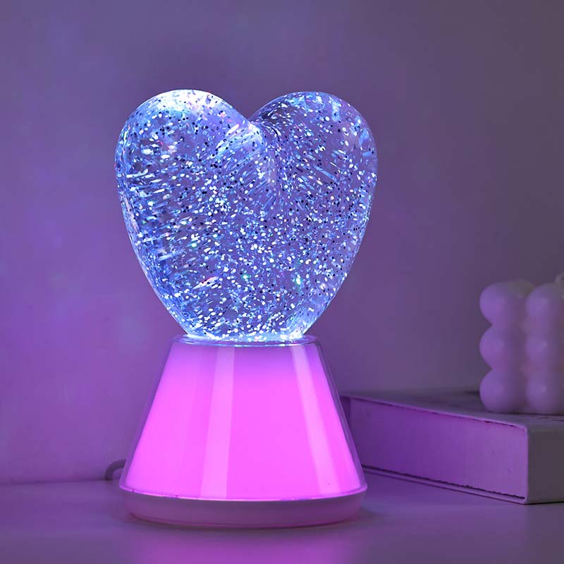 Luz noturna com brilho líquido que muda de cor e sombra de coração. apresenta uma requintada bola de vidro cheia de um líquido misterioso, na qual flutuam lantejoulas brilhantes. Milagrosamente, luz noturna com brilho líquido que muda de cor e sombra de coração como se estivesse dançando em um mundo mágico.