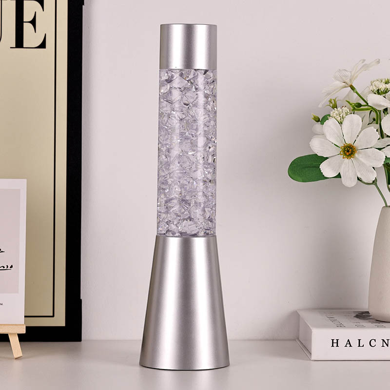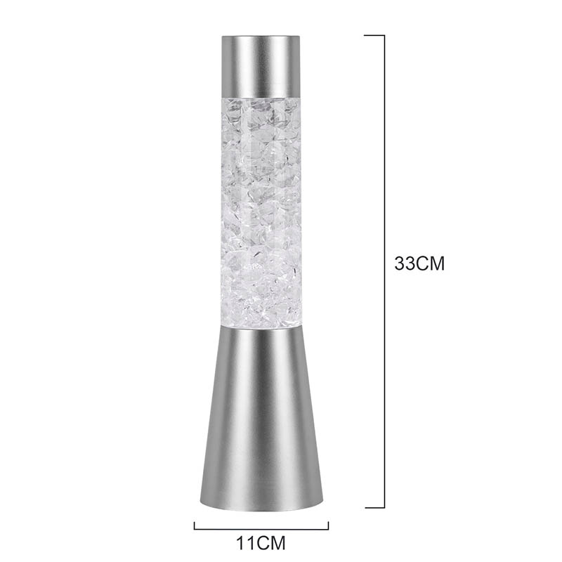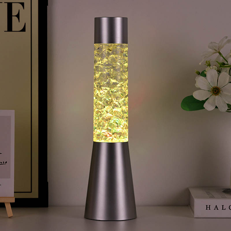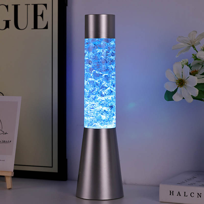 A luz noturna com brilho líquido que muda de cor e formato de gelo apresenta um design elegante e moderno com uma base metálica e uma seção superior transparente preenchida com peças coloridas semelhantes a cristal. A base do candeeiro foi concebida para ser estável e elegante, complementando qualquer estilo de decoração de casa. A seção transparente abriga as peças coloridas que se movem suavemente, criando um efeito visual hipnotizante. A lâmpada está disponível em três variações de cores diferentes – vermelho, azul e verde – permitindo-lhe escolher a tonalidade perfeita que combina com a sua decoração interior.