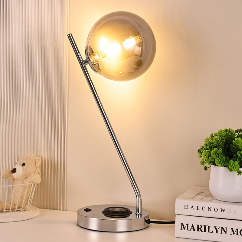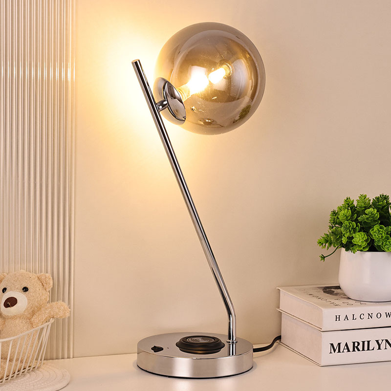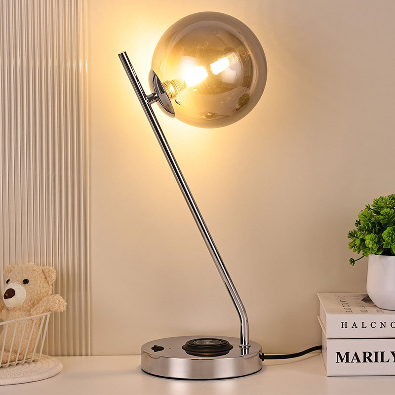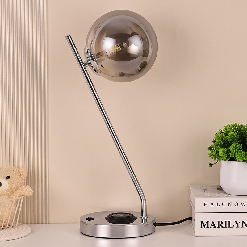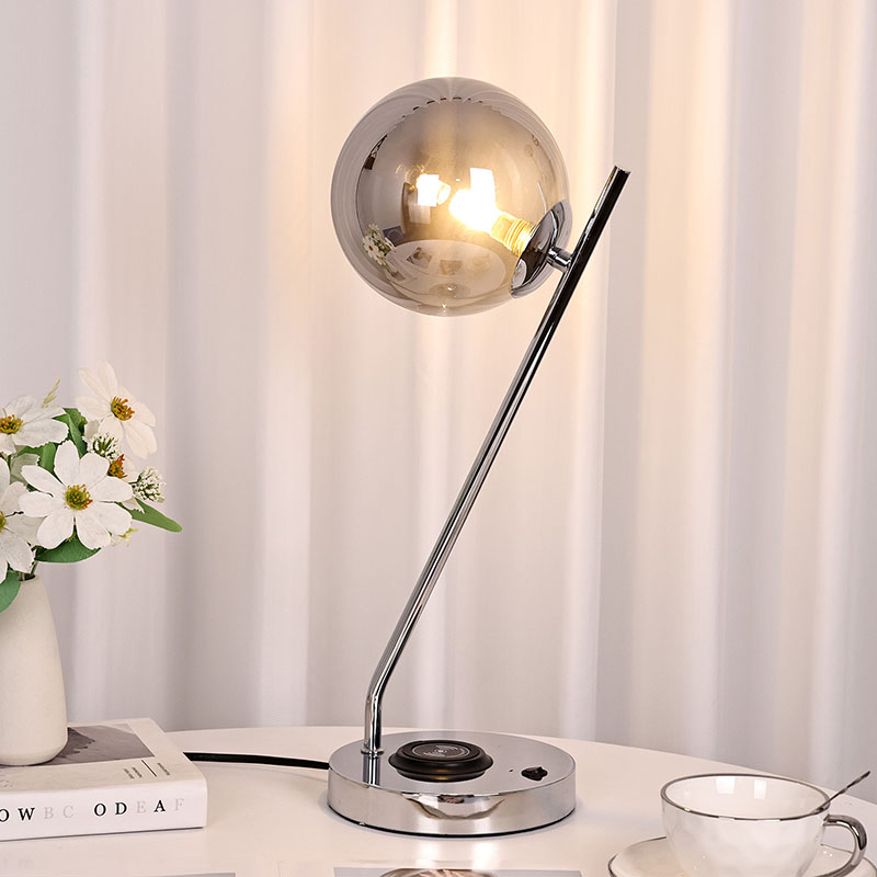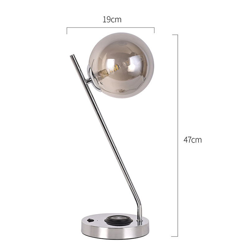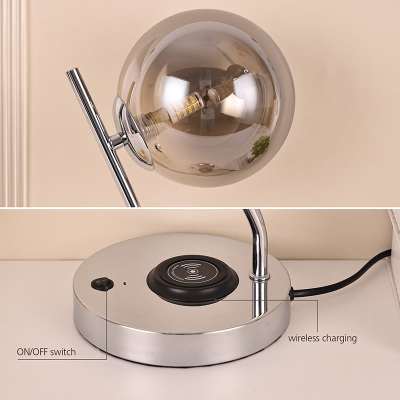 A luminária de mesa esférica de vidro escuro com carregador sem fio é feita em base de metal e vidro. A tampa de vidro não só confere à lâmpada uma textura transparente e pura, mas também difunde a luz de forma eficaz, tornando-a mais suave e uniforme. A base metálica foi finamente polida e tratada, com superfície lisa e delicada, confortável ao toque, e exala uma atmosfera nobre e elegante. Quer seja colocado no quarto, na sala de estar ou no escritório, este candeeiro de secretária combina perfeitamente com o ambiente envolvente, acrescentando uma atmosfera moderna e artística.