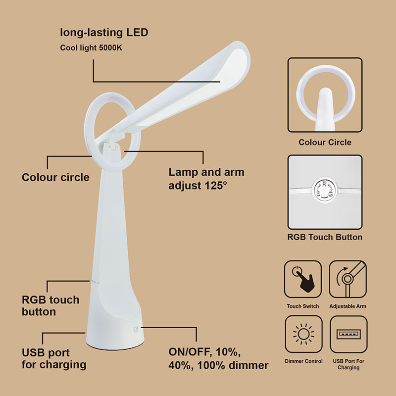 A luz da lâmpada de mesa LED RGB decorativa pode ter 3 dimmers no corpo do produto. A cabeça da luz LED pode abrir 125° no máximo.