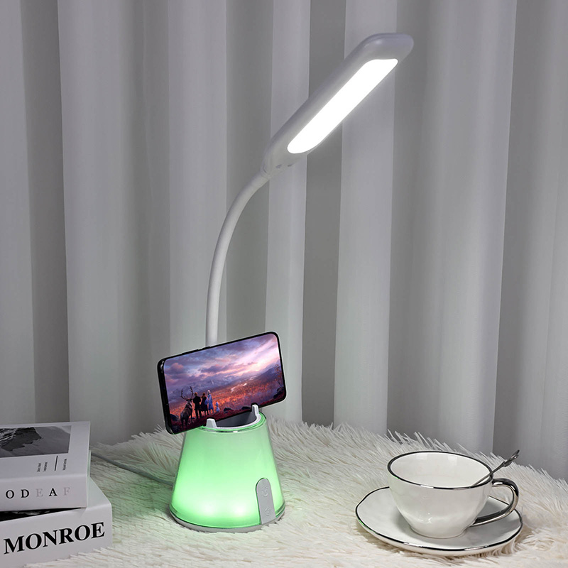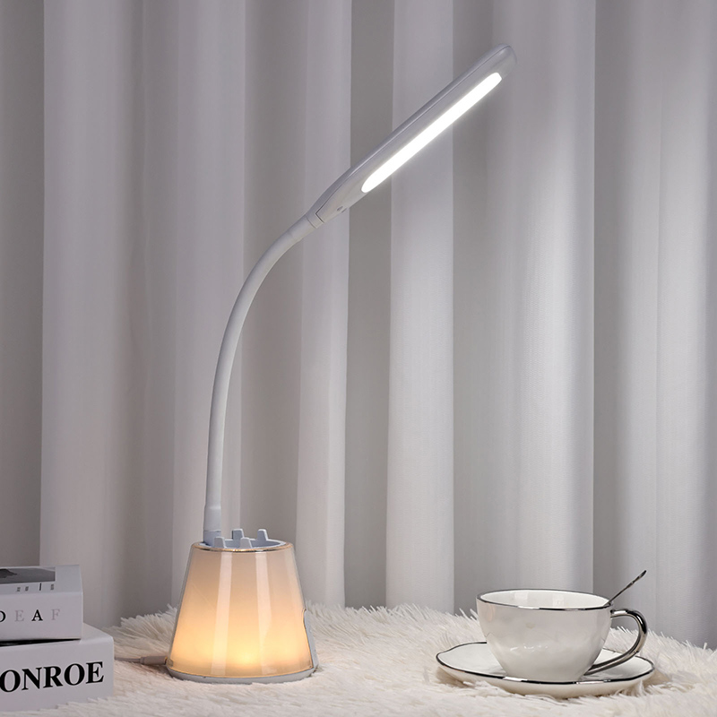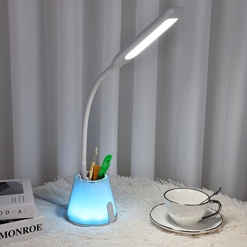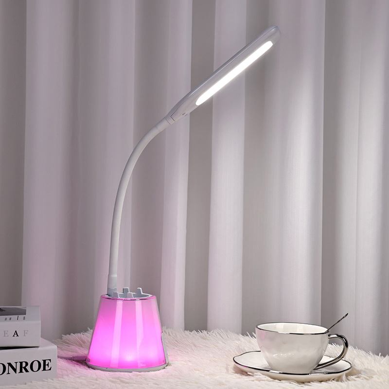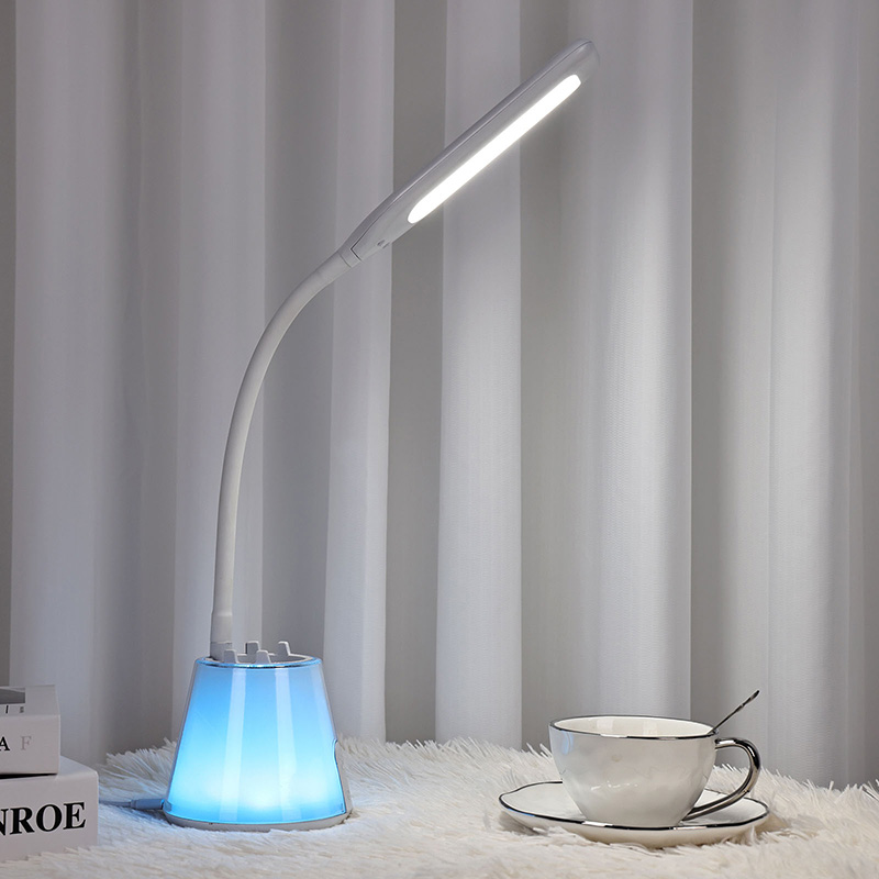 O candeeiro de secretária com suporte para caneta é composto por plástico, leve e compacto, com um design simples. É usado para leitura e escrita. A luz também pode ser ajustada em três intensidades diferentes para proteger melhor os olhos. A base foi projetada com mudanças de luz de cor RGB 6, permitindo que você aproveite a beleza das mudanças de cor enquanto descansa. Há também um porta-canetas acima da base que pode acomodar artigos de papelaria e lápis, e um porta-celular foi projetado na borda do porta-canetas, tornando-o conveniente para guardar seu telefone.