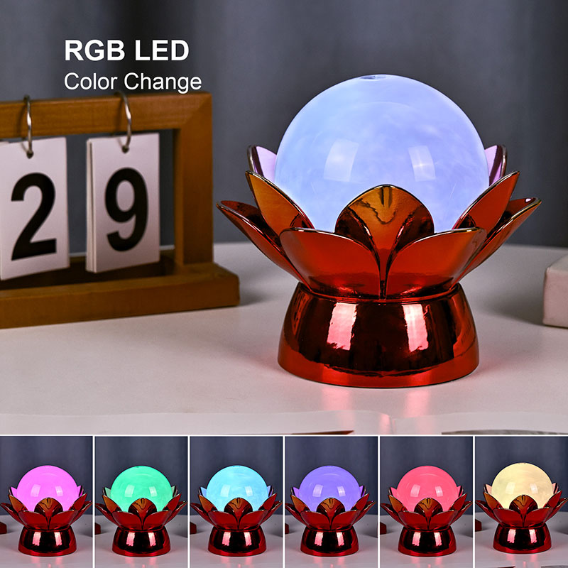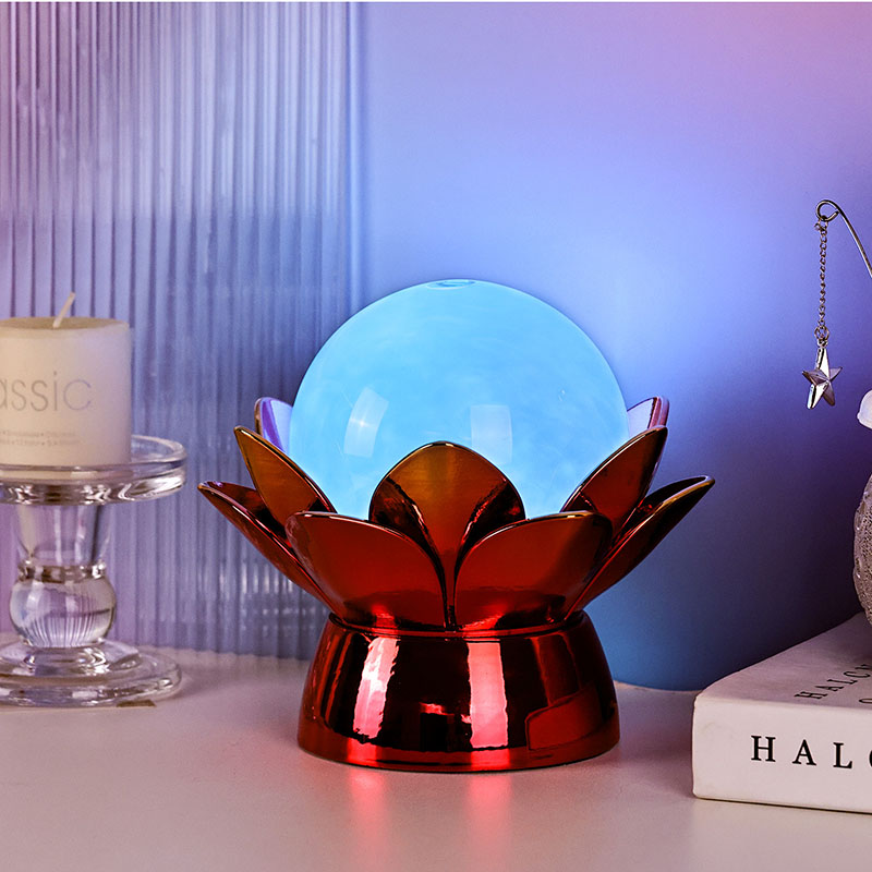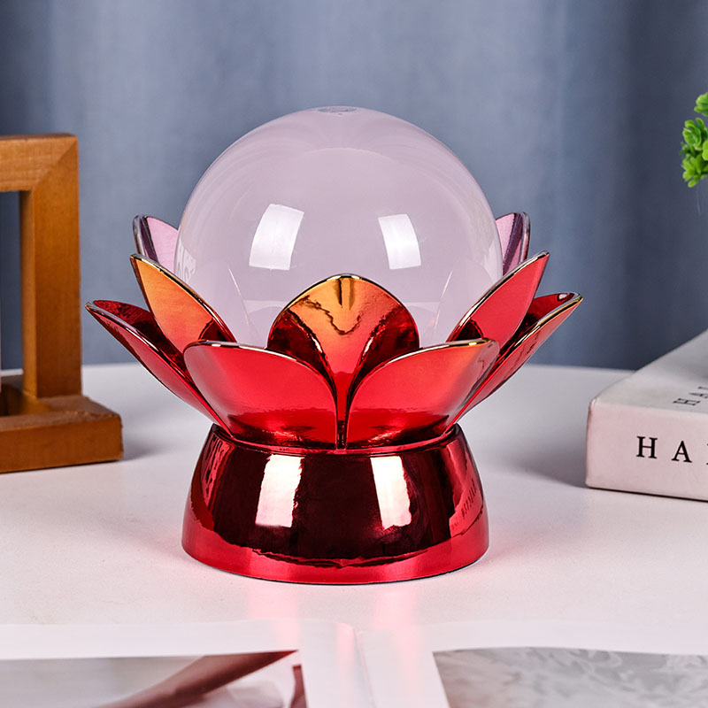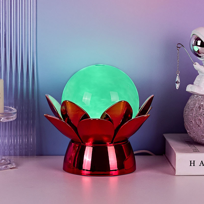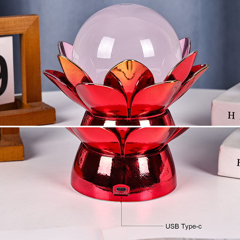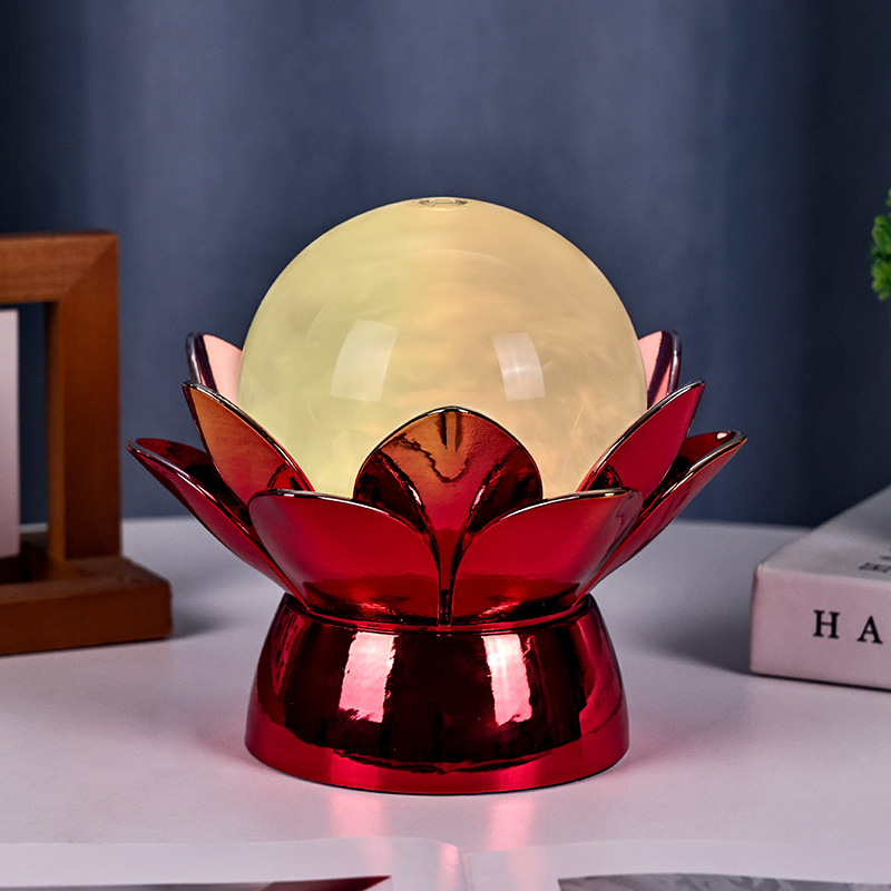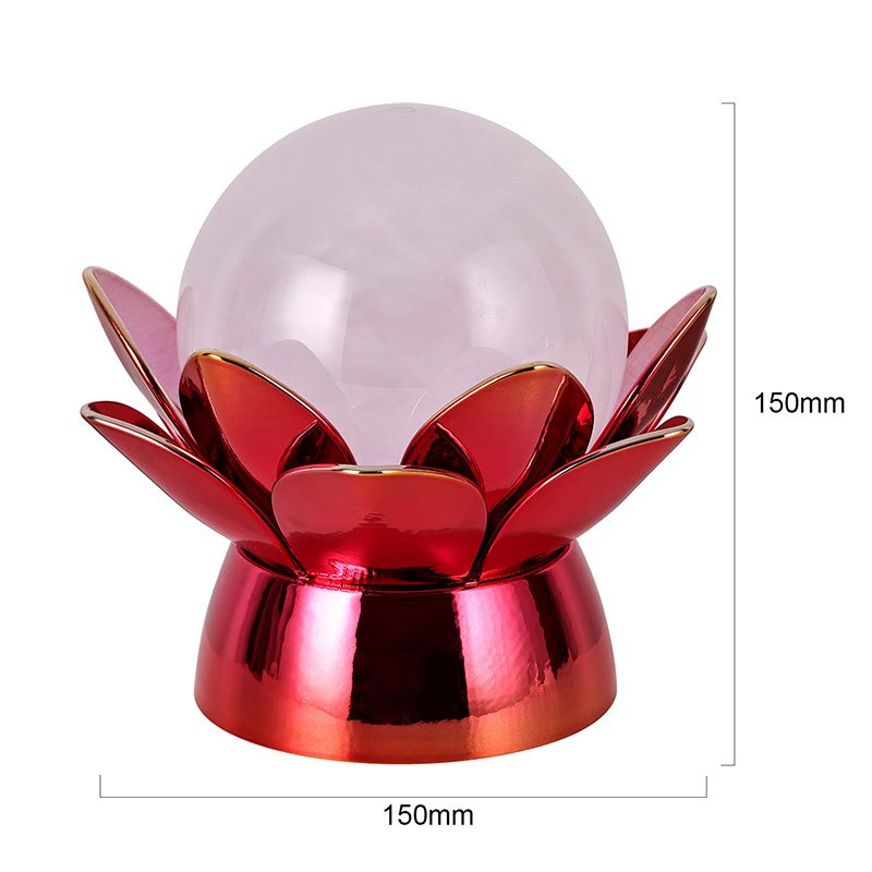 Fabricada com materiais de alta qualidade, a base é feita de metal polido com um impressionante acabamento vermelho-dourado que reflete a luz lindamente, adicionando profundidade e riqueza à sua aparência. O desenho do lótus não serve apenas como um ponto focal estético, mas também carrega um significado simbólico enraizado nas tradições orientais – representando iluminação, resiliência e harmonia. A superfície reflexiva potencializa o impacto visual, fazendo com que a lâmpada brilhe mesmo em ambientes com pouca iluminação.