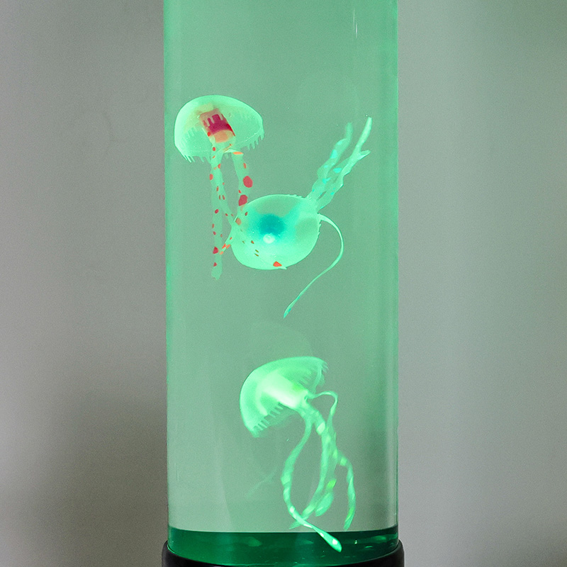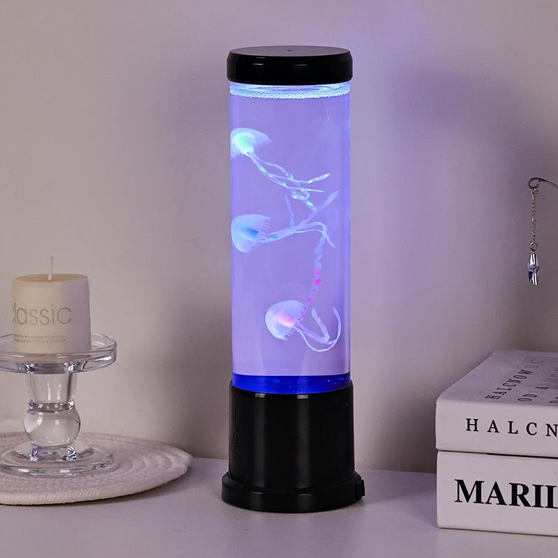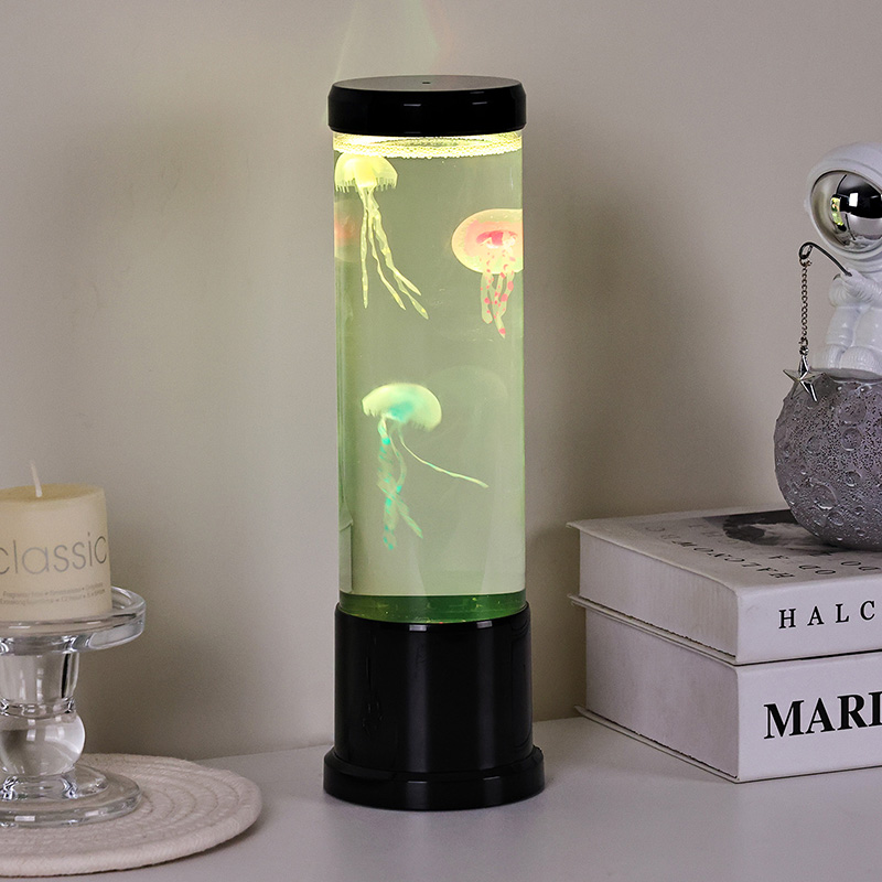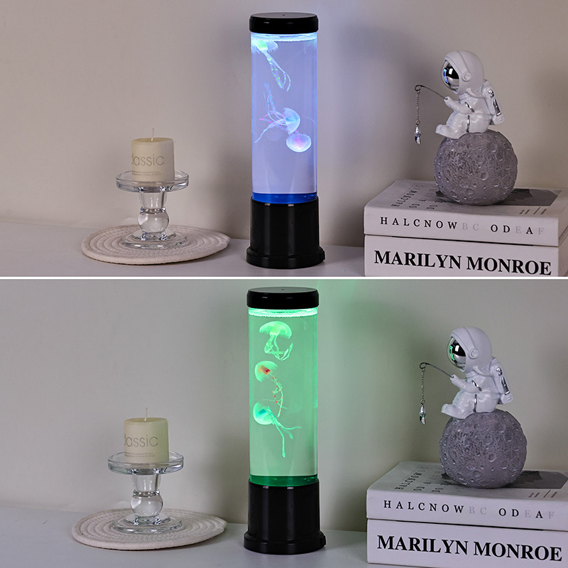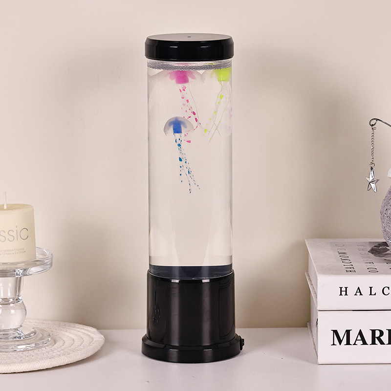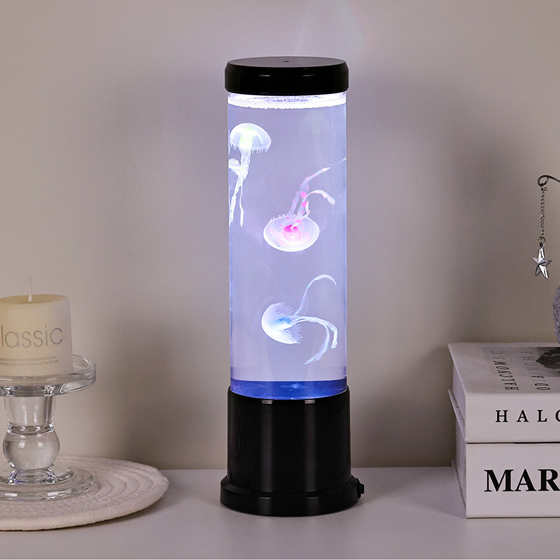 O design elegante encontra a inspiração na natureza A lâmpada LED de água-viva de alto tamanho apresenta um cilindro alto e fino feito de acrílico transparente de alta qualidade que permite uma visibilidade cristalina da graciosa água-viva dentro dela. Envoltas em um meio líquido azul suave, três águas-vivas realistas flutuam e pulsam suavemente, seus corpos translúcidos iluminados por luzes LED dinâmicas e multicoloridas. O brilho suave muda através de um espectro de tons suaves - desde azuis e roxos profundos do oceano até rosas e verdes suaves - imitando a bioluminescência encontrada em ambientes reais de águas profundas. A parte superior e a base do candeeiro têm acabamento em plástico preto brilhante, conferindo-lhe um aspecto moderno e minimalista que complementa qualquer estilo de decoração.