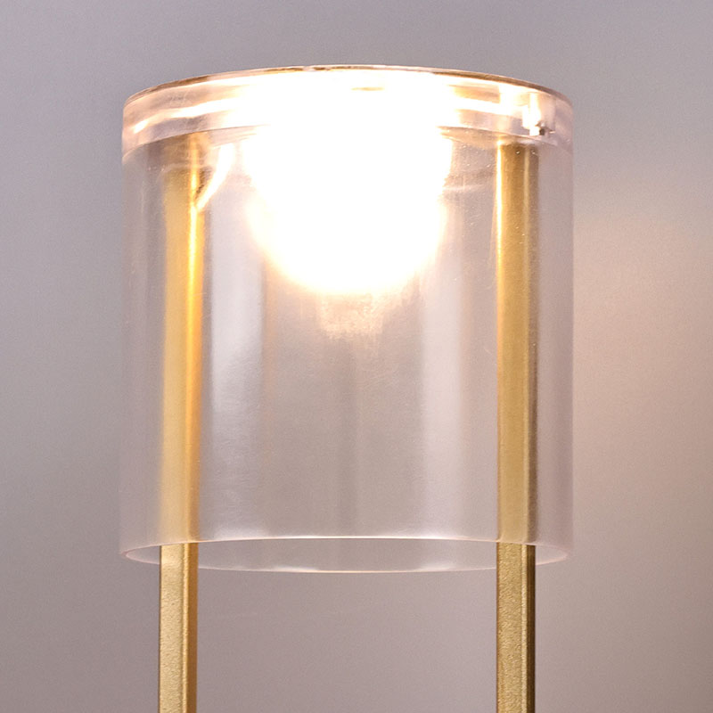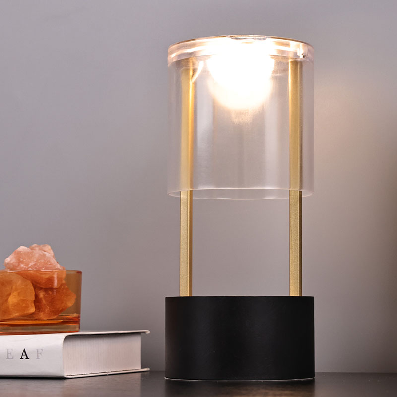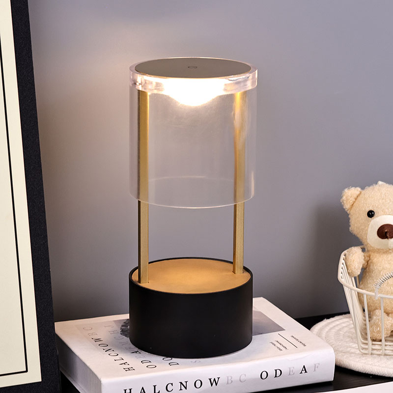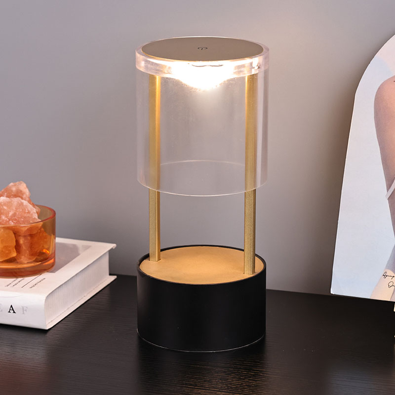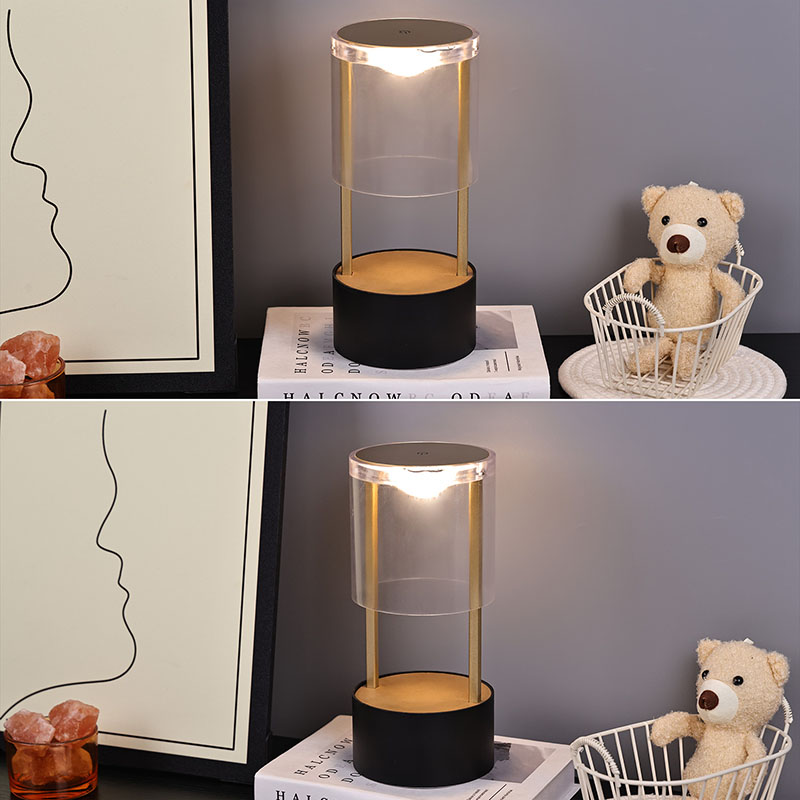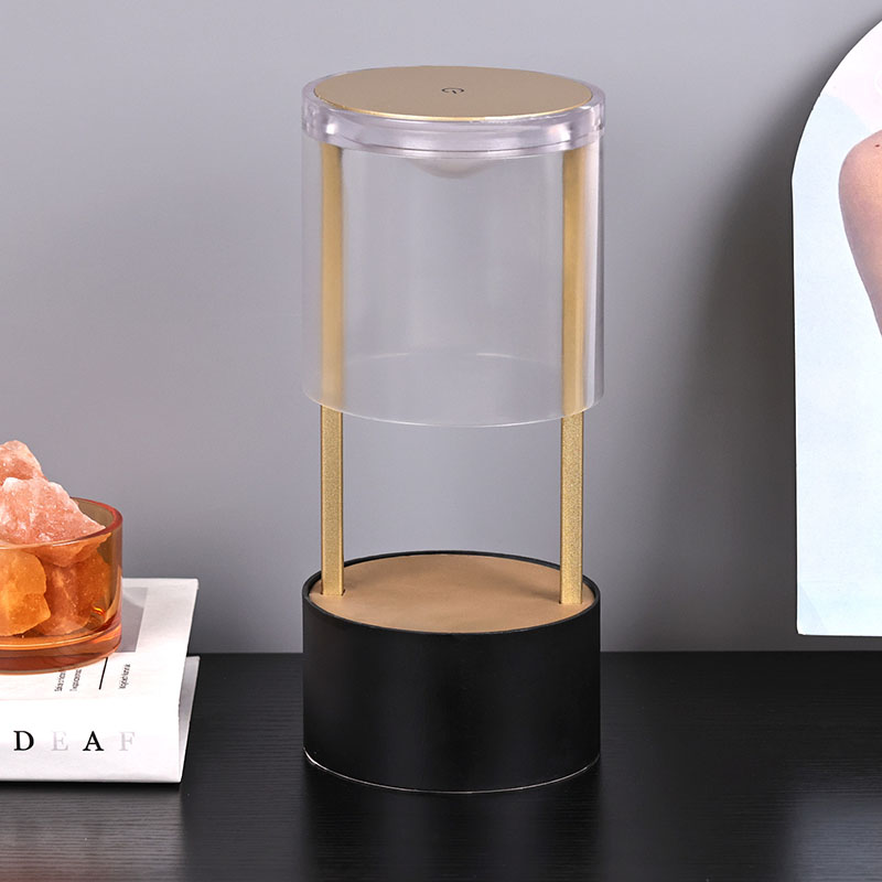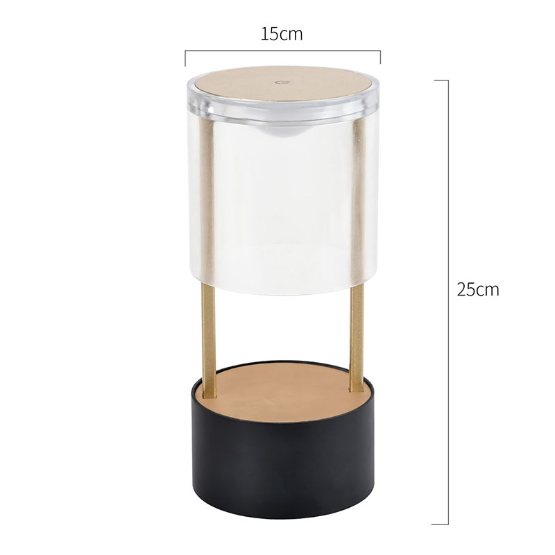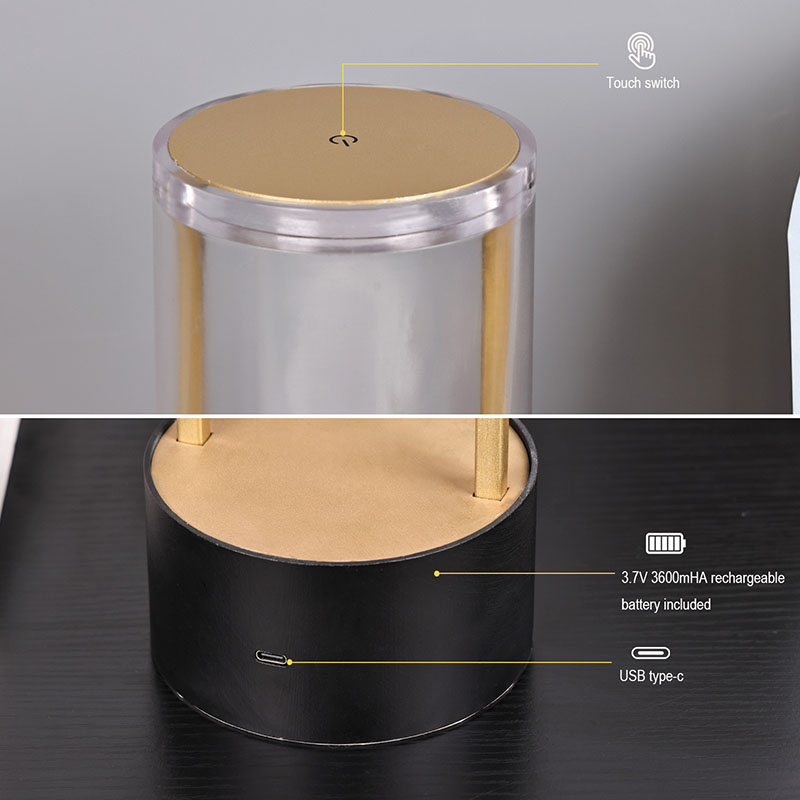 A parte superior do abajur pequeno estilo lanterna é um interruptor de luz sensível ao toque, com uma cabeça de carregamento recarregável tipo C na parte inferior. A parte superior é composta por uma tampa de acrílico transparente e a parte inferior por uma base metálica. A estrutura circular geral permite iluminação móvel