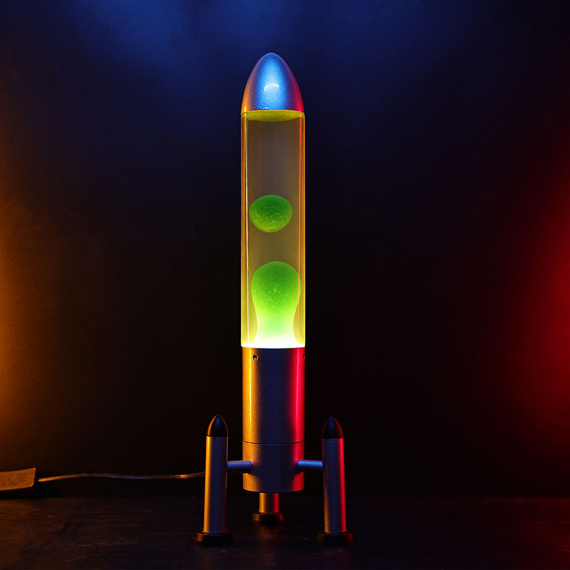 A lâmpada de cera em forma de foguete de pouso na lua tem água pura dentro do vidro transparente e cera verde dentro. Depois de ser aquecido, a cera flutua irregularmente na água, que é muito apreciada.
