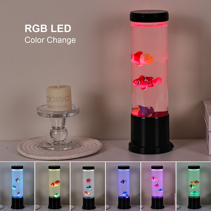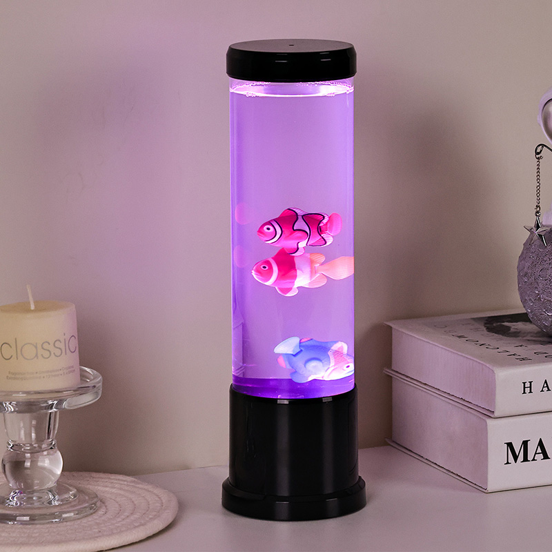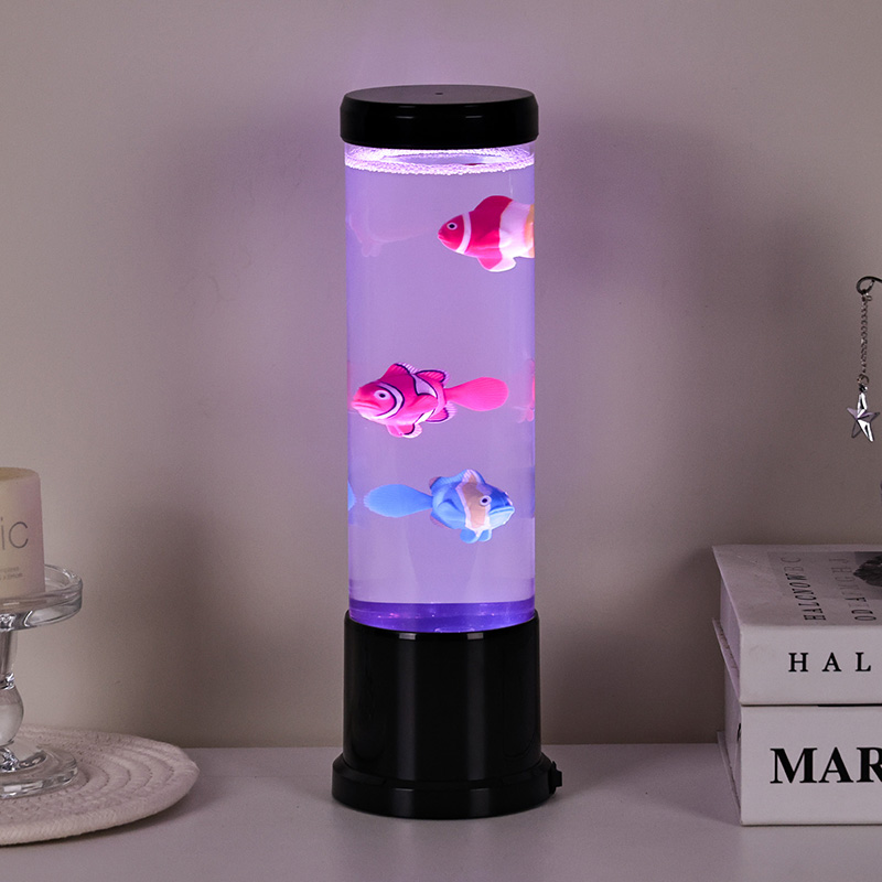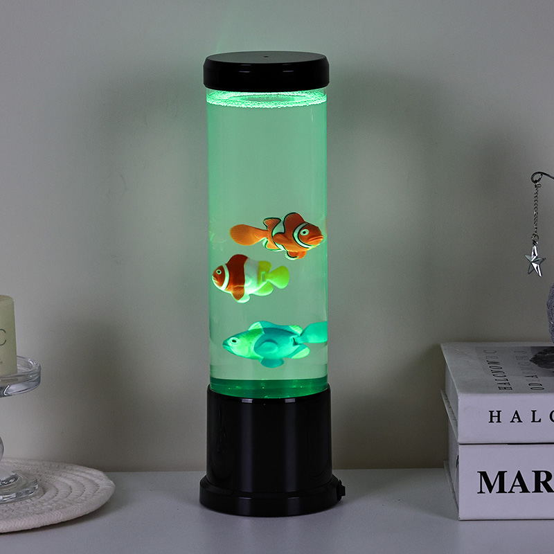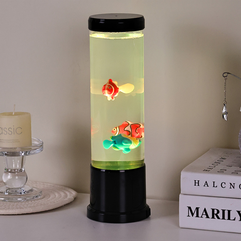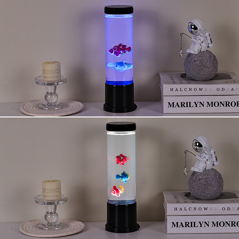 No centro desta lâmpada está uma simulação cuidadosamente elaborada de um aquário real. Dentro da coluna transparente, você encontrará figuras de peixes flutuantes lindamente detalhadas - como peixes-palhaço vibrantes e outras espécies tropicais - que se movem suavemente e nadam através do líquido semelhante à água. A adição de águas-vivas brilhantes aumenta a ilusão mágica subaquática, pulsando suavemente com luz etérea. A combinação de movimento e cor cria um cenário dinâmico que cativa a atenção e traz paz ao seu ambiente.