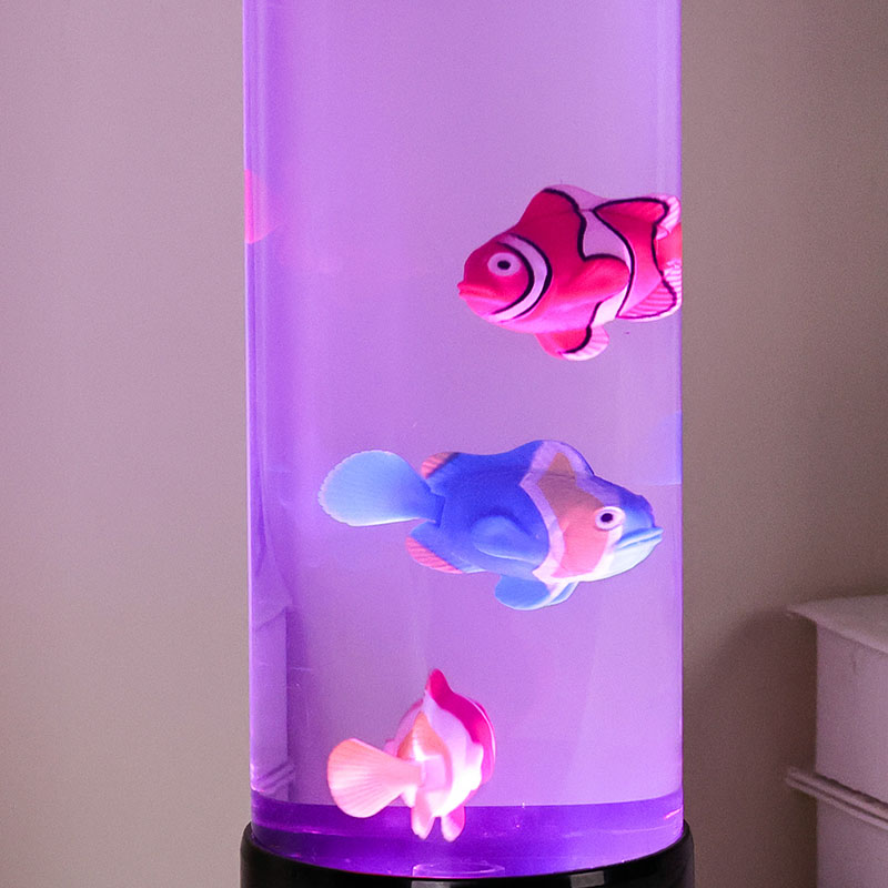 O líquido interno é especialmente formulado para imitar o fluxo natural da água, permitindo que peixes e águas-vivas flutuem lentamente, melhorando a aparência natural. Este movimento, combinado com a mudança das cores do LED, proporciona uma tela em constante evolução que nunca parece repetitiva.