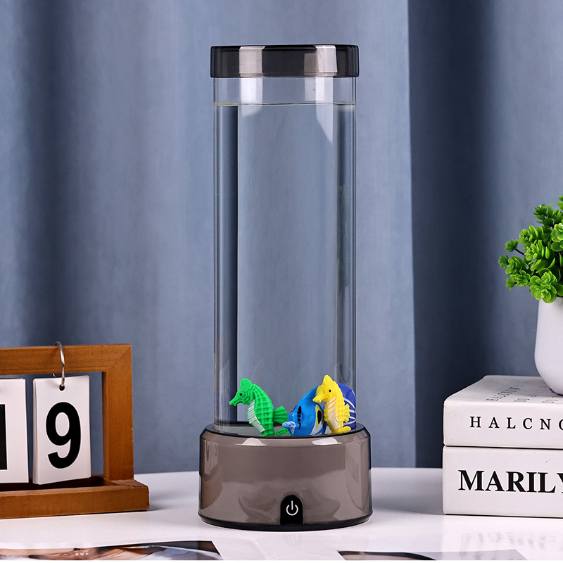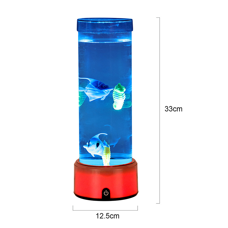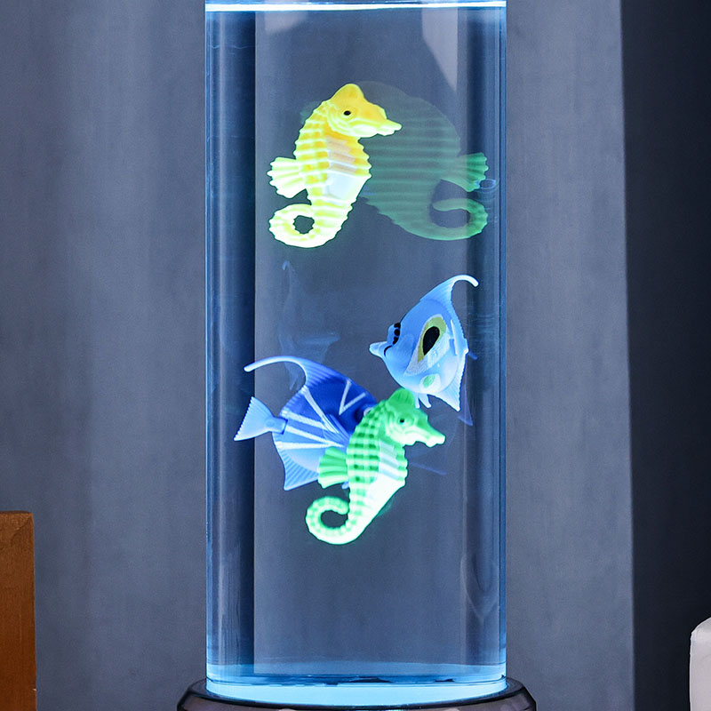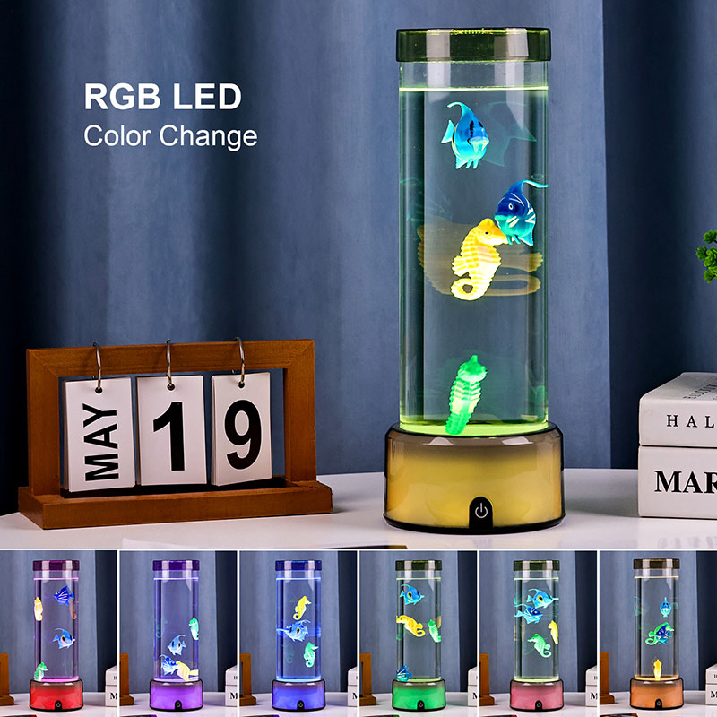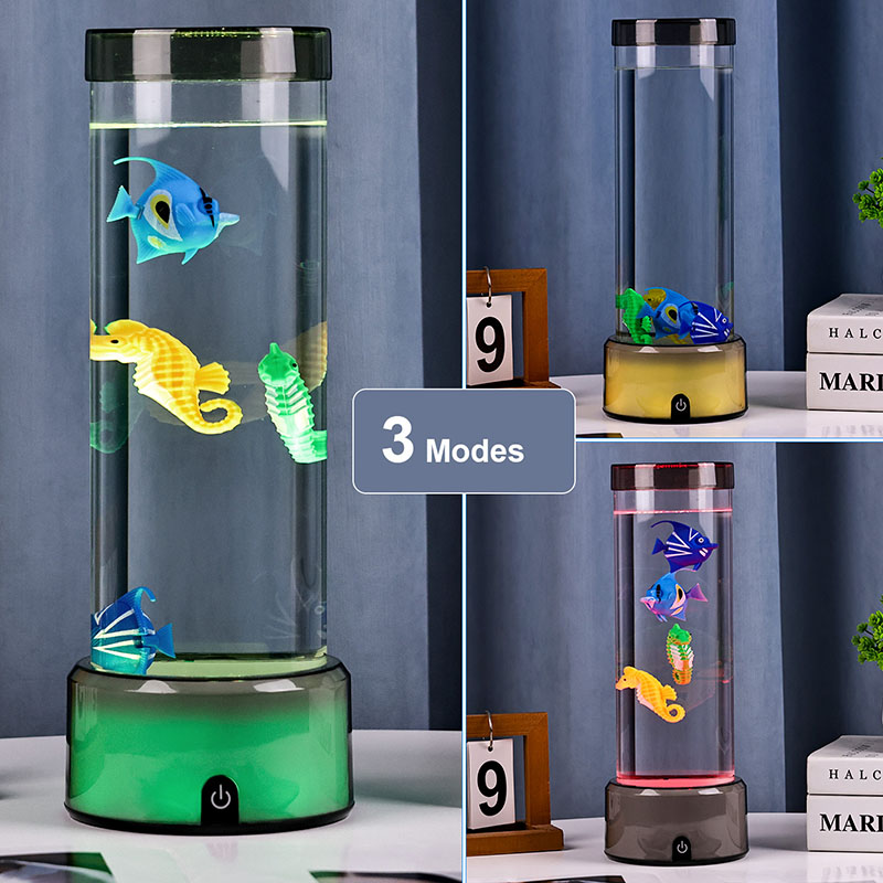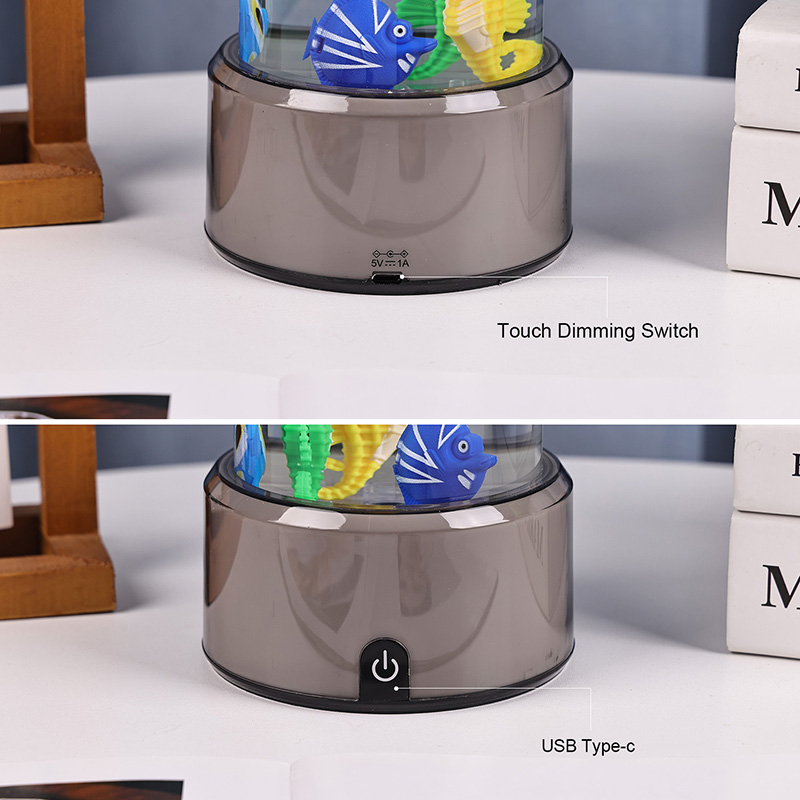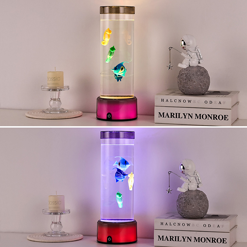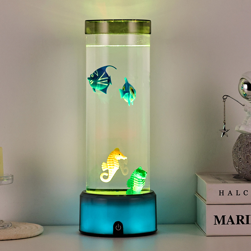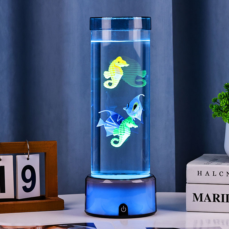 charme. Fabricada em plástico durável de alta qualidade, esta lâmpada cativante apresenta um corpo cilíndrico elegante preenchido com um líquido transparente e figuras de peixes flutuantes lindamente detalhadas - incluindo peixes tropicais vibrantes e um encantador cavalo-marinho - criando uma cena oceânica serena e realista que traz tranquilidade e deleite visual a qualquer ambiente.