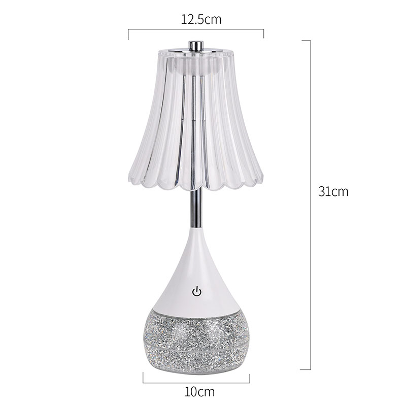 Lâmpada de mesa LED com escurecimento contínuo com abajur de luxo. Este design de lâmpada de mesa é feito de caixa de vidro de plástico, com foco na criação de um design transparente e luxuoso. O abajur é feito de material acrílico transparente, com desenho linear e tampa externa transparente. A luz pode ter cores quentes, composição de luz branca de caixa de cor natural, e várias cores podem ajustar a intensidade da luz, o que será muito bom. O fundo é composto por líquido dentro da garrafa de vidro, e a luz líquida pode ser composta por cores de ilusão RGB.