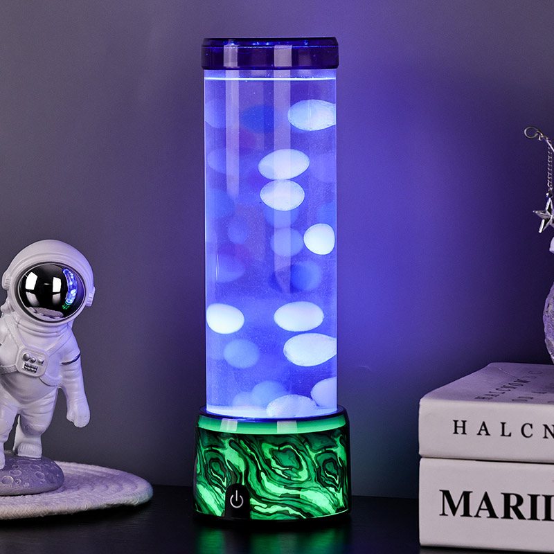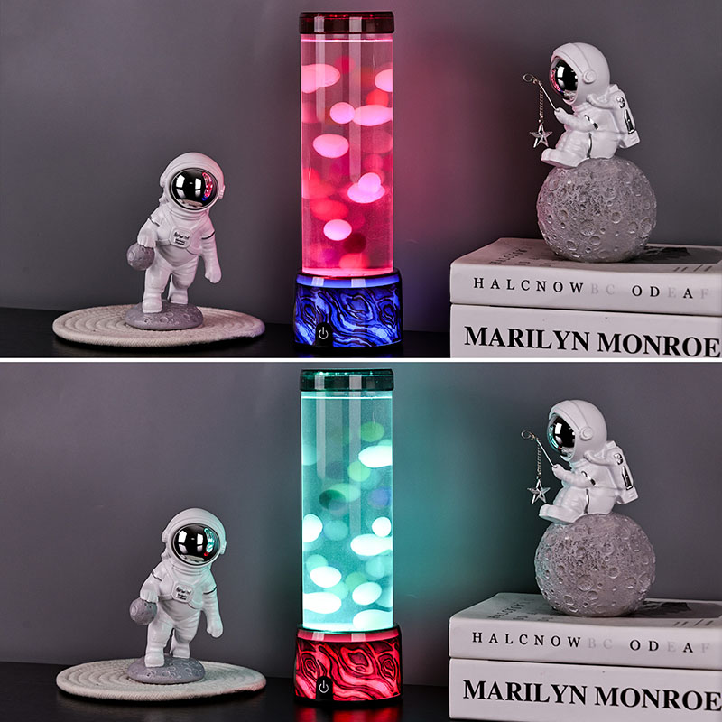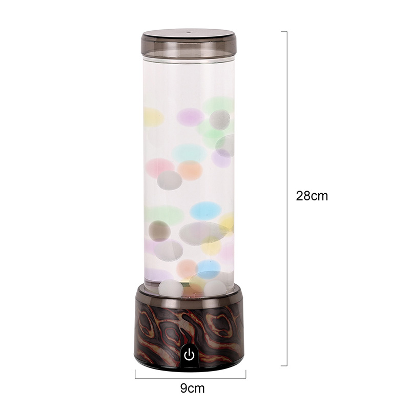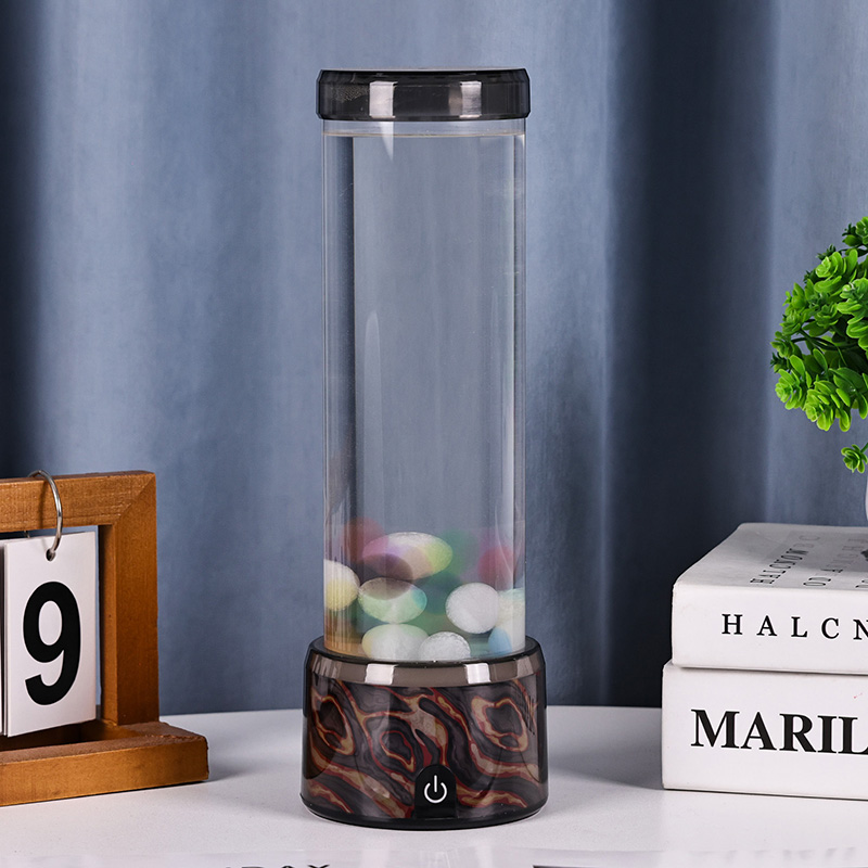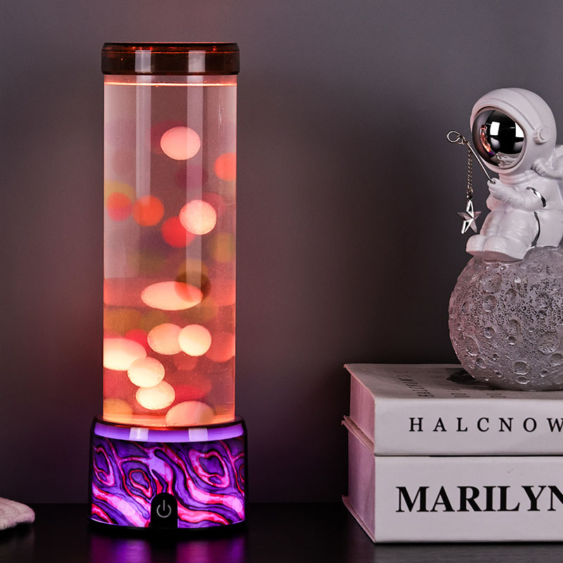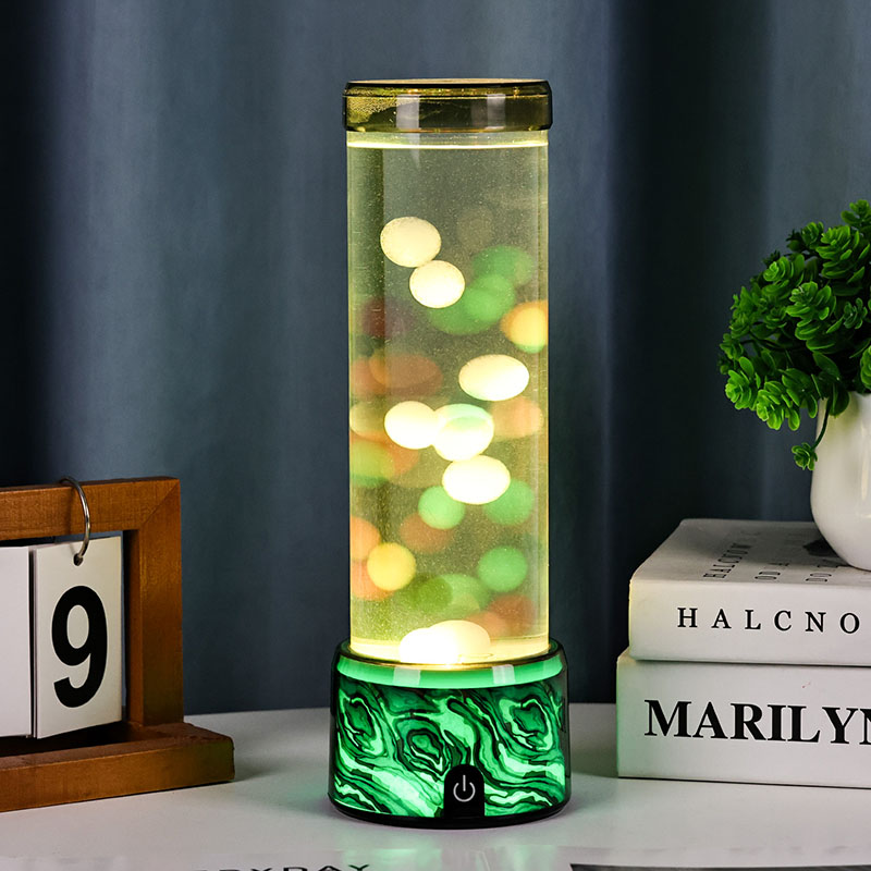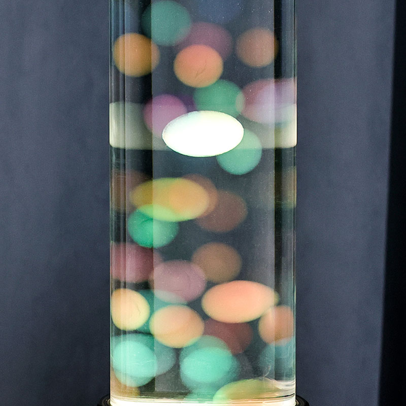 A coluna cilíndrica de vidro sobe graciosamente a partir da base, preenchida com um líquido transparente e esferas coloridas flutuantes em miniatura que sobem e descem suavemente como pequenas bolhas em câmera lenta. Essas pequenas esferas luminosas capturam e refletem as mudanças nas luzes LED abaixo, criando uma experiência visual dinâmica