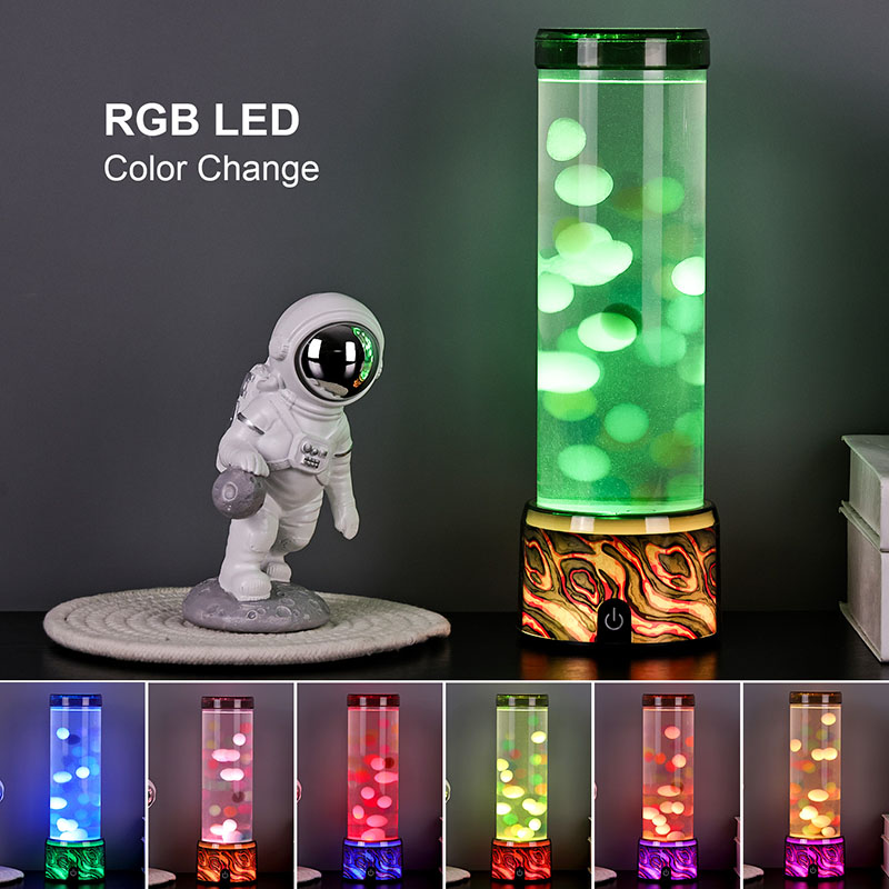 Apresentando a lâmpada Magical Glow Lava - uma luz noturna decorativa hipnotizante com base que muda de cor RGB e bolhas coloridas flutuantes