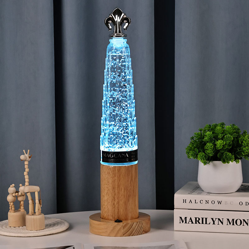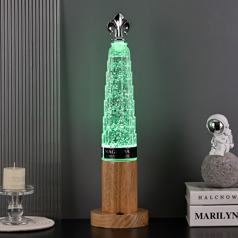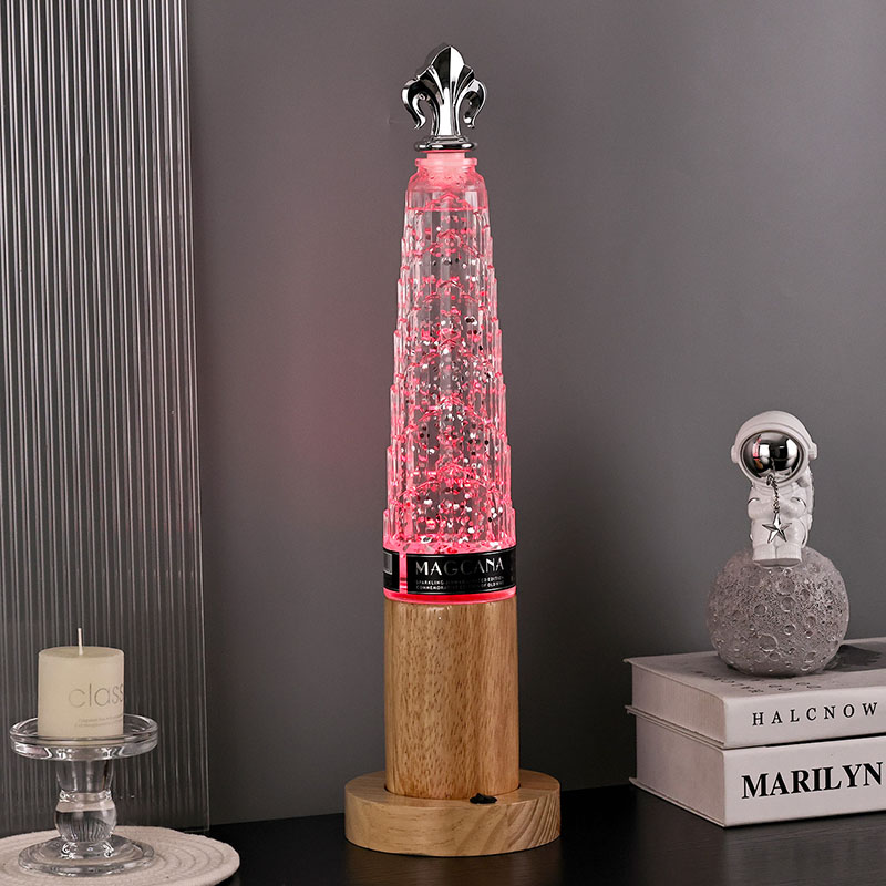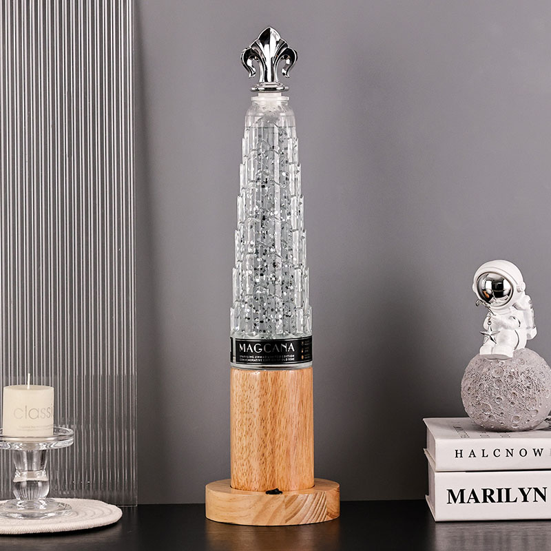 O abajur com glitter em forma de torre adota um design clássico em forma de torre, com decorações de metal requintadas embutidas na parte superior, simples, mas nobre. O frasco de vidro transparente contém líquido e
