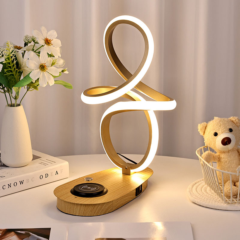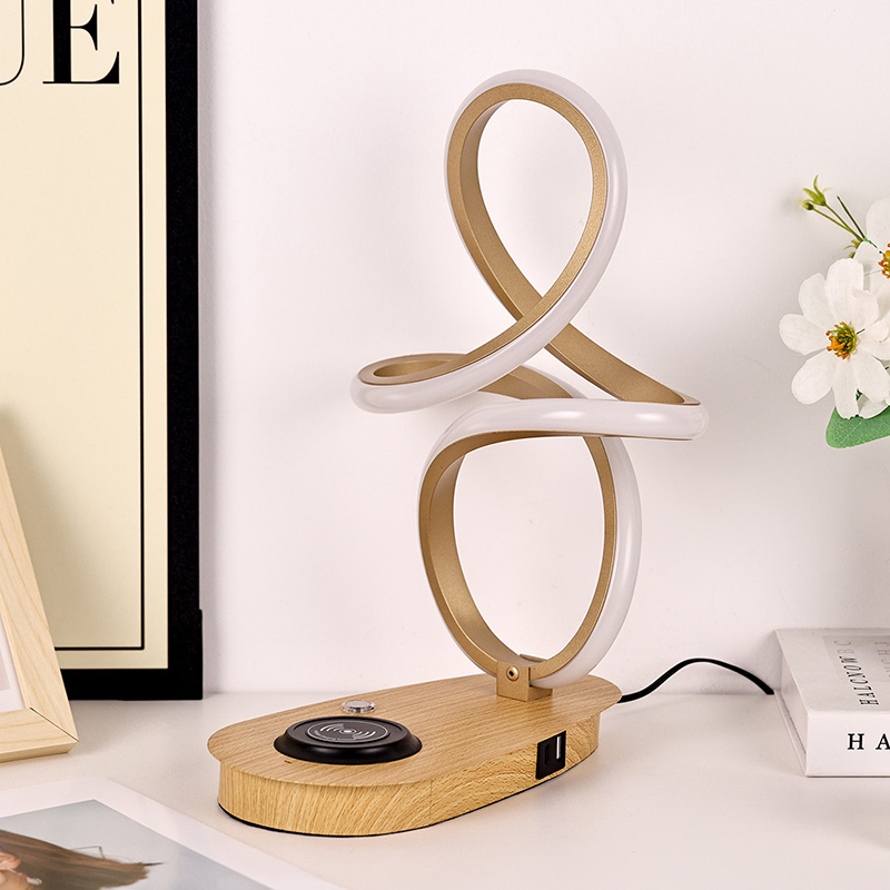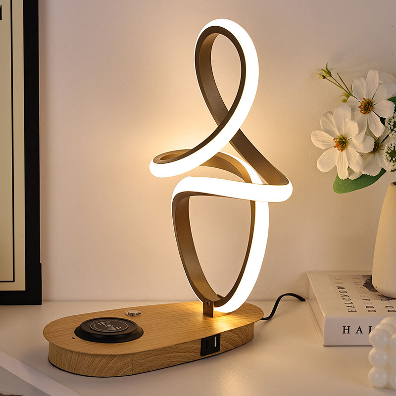 na base de madeira do abajur de mesa, o abajur LED com carregador sem fio com torção de massa frita é uma luz LED quente.