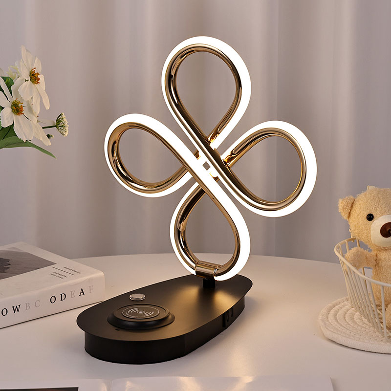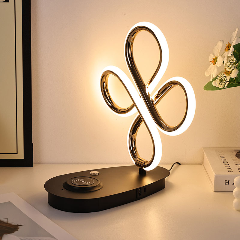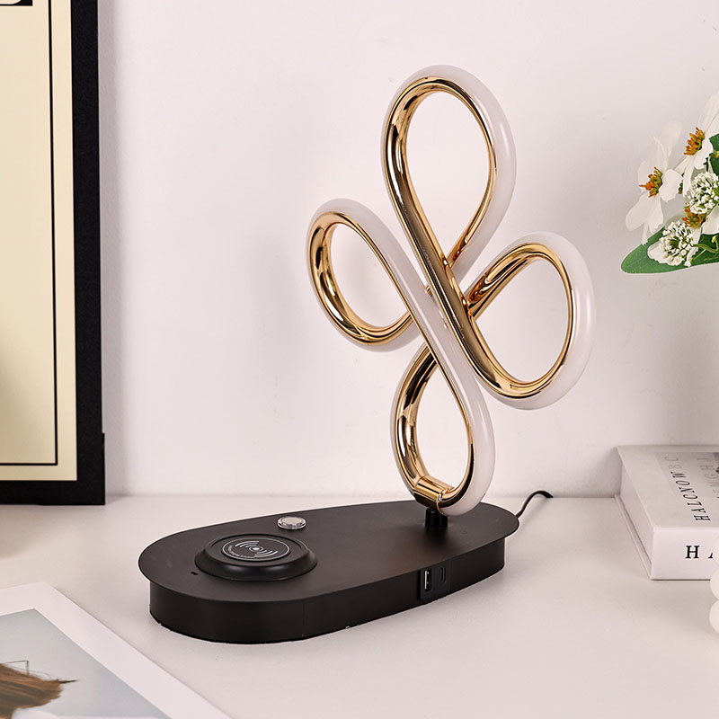 A lâmpada de mesa LED com carregador sem fio com abajur de flores é composta por uma estrutura principal de metal.